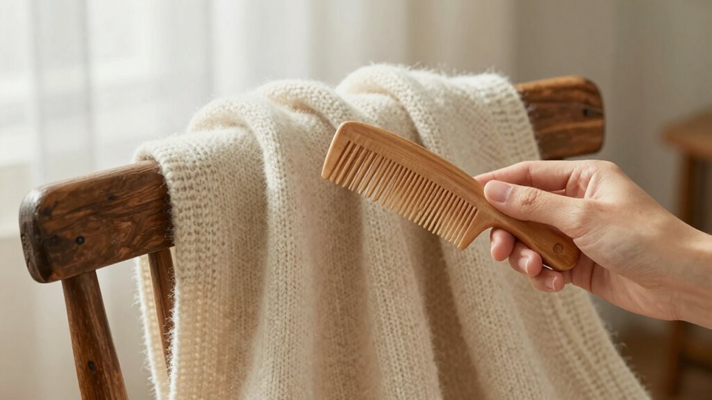 To keep your cashmere soft and fuzz-free, you should lay it flat to dry. Avoid hanging your sweater, which can stretch the fibers, and instead, use towels to support its weight. Proper drying techniques make a big difference in maintaining your cashmere’s quality. Additionally, proper home care can help you better maintain your clothing and household items over time. In particular, controlling contrast ratio during drying can improve the overall appearance by preventing uneven fading or discoloration. Being mindful of fabric care guidelines can further extend the lifespan of your delicate garments. Incorporating the right DIY tools and safety tips can also make your laundry routine safer and more effective.