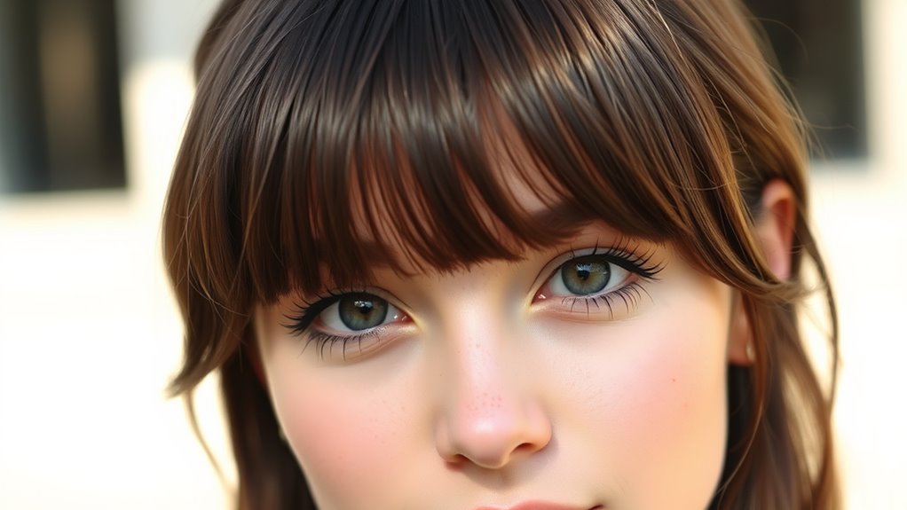 If you have an oval, heart, or square face shape, baby bangs can look fantastic on you. They frame your face beautifully and highlight your features. To pull off this bold fringe, consider styling tips like keeping the bangs slightly tousled or sleek, depending on your look. Avoid if you have a round face, as they might make your face appear rounder. Confidence and proper styling make all the difference!