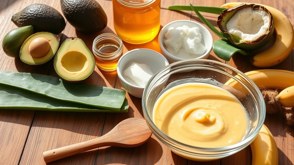 For nourishing hair masks you can make at home, try combining natural ingredients like honey and olive oil for deep hydration, banana and yogurt to repair and soften, avocado and coconut oil for nourishment, or lemon and honey to brighten. Incorporate treatments like apple cider vinegar rinses for shine or clay masks to detox your scalp. Keep consistent for best results and discover more easy recipes that suit your hair needs just ahead.