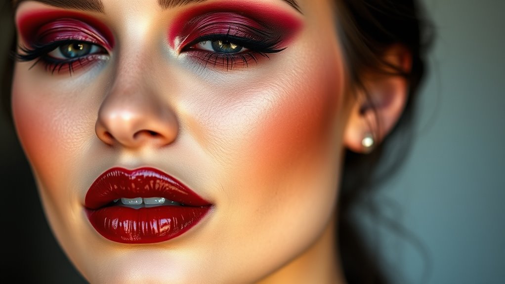 To create stunning dark cherry makeup looks with rich reds and berries, start with a smooth eye primer to make the deep shades pop and stay flawless. Define your eyes with smoky burgundy or plum shadows and add black or brown eyeliner for drama. Pair this with glossy berry lips, exfoliated and moisturized for a perfect finish. Balancing bold eyes or lips is key to a confident, sophisticated style—discover more tips to elevate your look as you go.