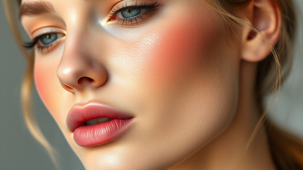 Draping blush is a technique that uses strategic placement and blending of color to sculpt and define your face naturally. By choosing shades that complement your skin tone and using the right tools, you can highlight your cheekbones, jawline, and collarbones for a lifted, radiant look. Proper preparation, application, and blending are key to achieving seamless results. If you want to unseal more tips and tricks, keep exploring how to perfect this sophisticated approach.