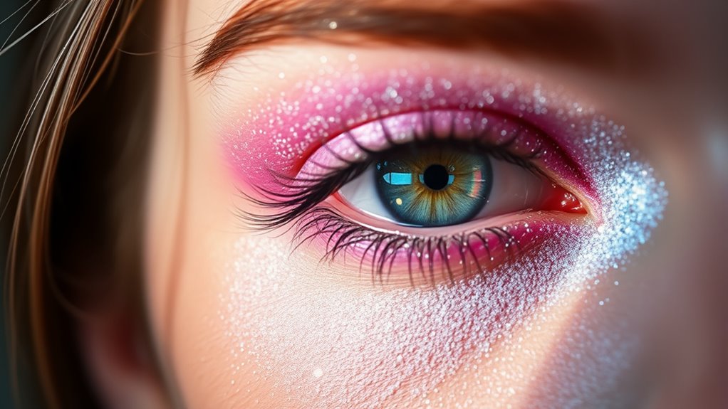 Think of glitter fallout as tiny stars escaping your galaxy of eyeshadow—prevent it by applying a good primer first. The primer acts like a magnet, holding the frosted shades in place and stopping glitter fallout from drifting onto your cheeks. Tap off excess product from your brush, and build your look gradually, like layering a delicate cake. This keeps your frosted eyeshadow shimmering without the mess, ensuring a flawless finish.