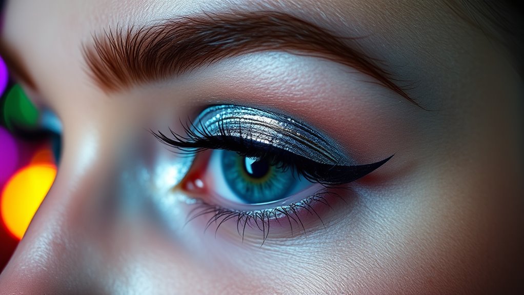 Finding the right metallic eyeliner shade can elevate your party look, but selecting the one that complements your skin tone is key. If you have fair skin, opt for cool-toned metallic eyeshadows like silver or icy blue to make your eyes pop. Incorporating warm color palettes can also enhance your overall appearance and create harmony with your skin tone. Medium skin tones look stunning with warm metallics such as bronze or copper, which add warmth and depth. For darker skin, rich golds or deep bronze shades create a striking contrast. Remember, after applying your metallic eyeliner, curling your eyelashes enhances the shimmer’s impact by opening up your eyes. The right shade not only highlights your eye color but also complements your overall look, making your party makeup unforgettable. Understanding how different metallic shades interact with skintone and eye color can help you choose the most flattering options for any occasion. Choosing the perfect metallic hue is all about balancing tone and contrast for a radiant, eye-catching finish.