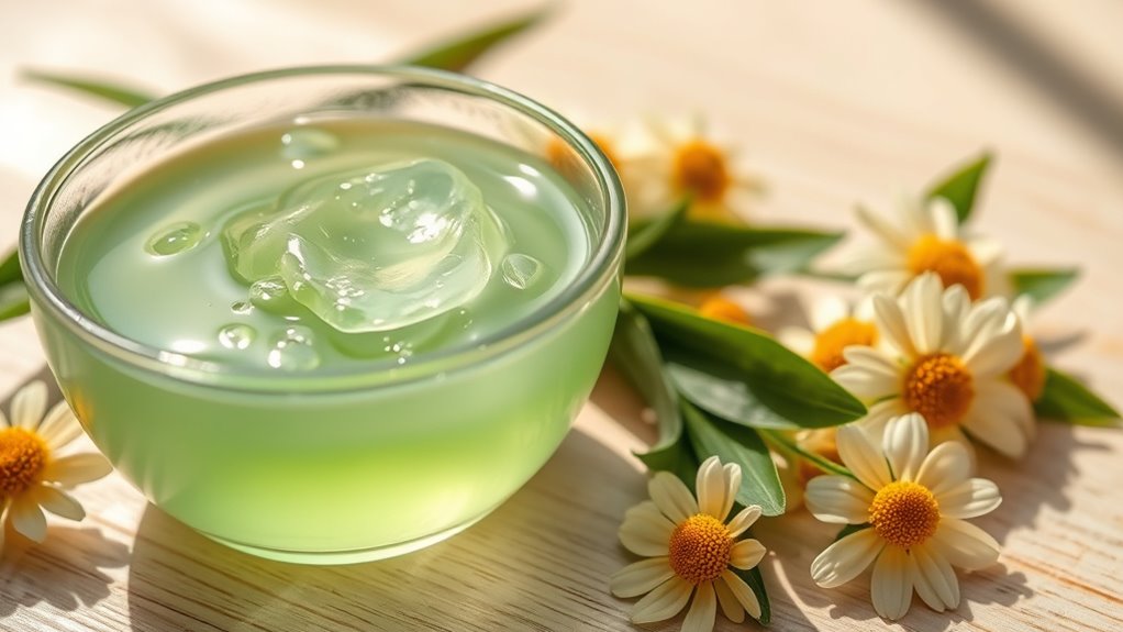 To soothe stressed skin, look for calming ingredients like chamomile, calendula, and aloe vera, which reduce redness and inflammation. Anti-inflammatory agents such as niacinamide, green tea extract, and colloidal oatmeal help strengthen your skin barrier and promote healing. Combining these natural extracts with proven anti-inflammatories enhances their calming effects, offering gentle relief and protection for sensitive skin. Keep exploring to discover how to effectively incorporate these ingredients into your skincare routine.
