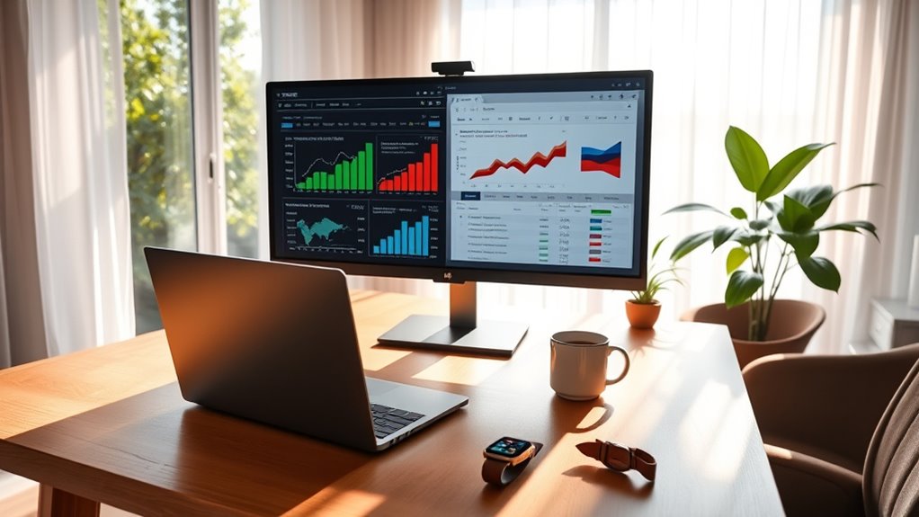 How can you minimize distractions and stay focused when working remotely? Start by creating a dedicated workspace that signals to your brain it’s work time. Invest in ergonomic furniture to support comfort and reduce physical strain, helping you stay alert. Keep your workspace organized and clutter-free to prevent distractions. Incorporate aesthetic decor that inspires you and maintains a professional atmosphere, making it easier to shift into work mode. Avoid mixing personal items or entertainment in this space.