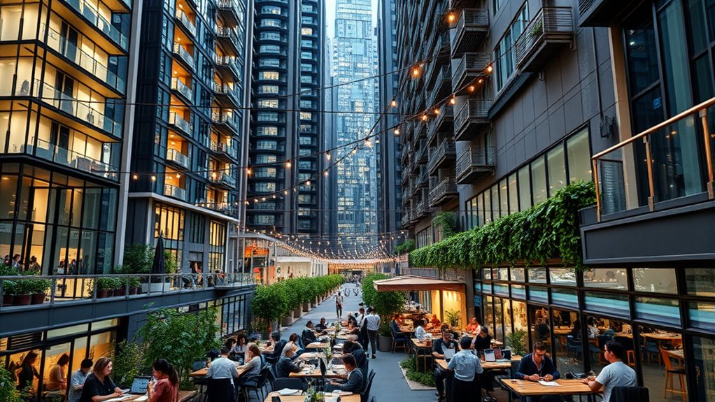 As urban areas grow, thriving in small living spaces and co-working communities becomes essential. You can maximize limited space with smart furniture, vertical gardens, and innovative storage. Co-working hubs foster networking, collaboration, and flexibility for your work routine. Sustainable design and technology help reduce costs and boost efficiency. Embracing these trends allows you to enjoy a vibrant, connected lifestyle. Keep exploring to discover how these innovations can transform your urban experience.