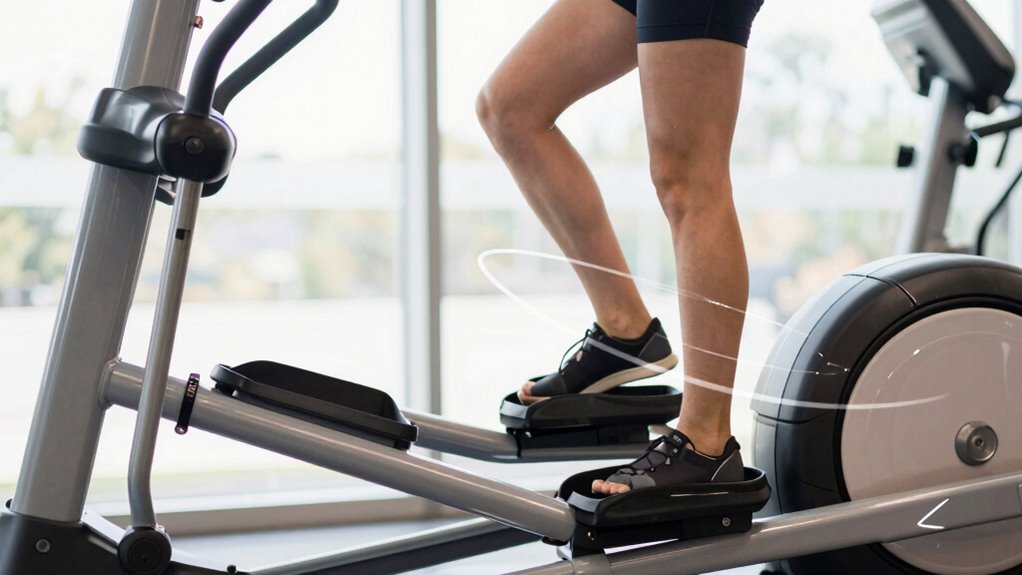 Finding the most natural and ergonomic stride on your elliptical starts with paying close attention to how your body moves during exercise. Focus on your stride biomechanics—how your legs, hips, and arms coordinate. Modern elliptical technology offers adjustable stride options, so experiment to discover what feels best for your body. Keep your movements smooth and controlled, avoiding overextension or excessive force. Your goal is to mimic natural walking or running patterns while minimizing strain. Ascertain your knees stay aligned and your feet remain flat on the pedals. Adjust the stride length if possible, so it matches your height and comfort level. By tuning into your body’s signals and understanding elliptical technology, you’ll optimize your workout for both safety and efficiency.