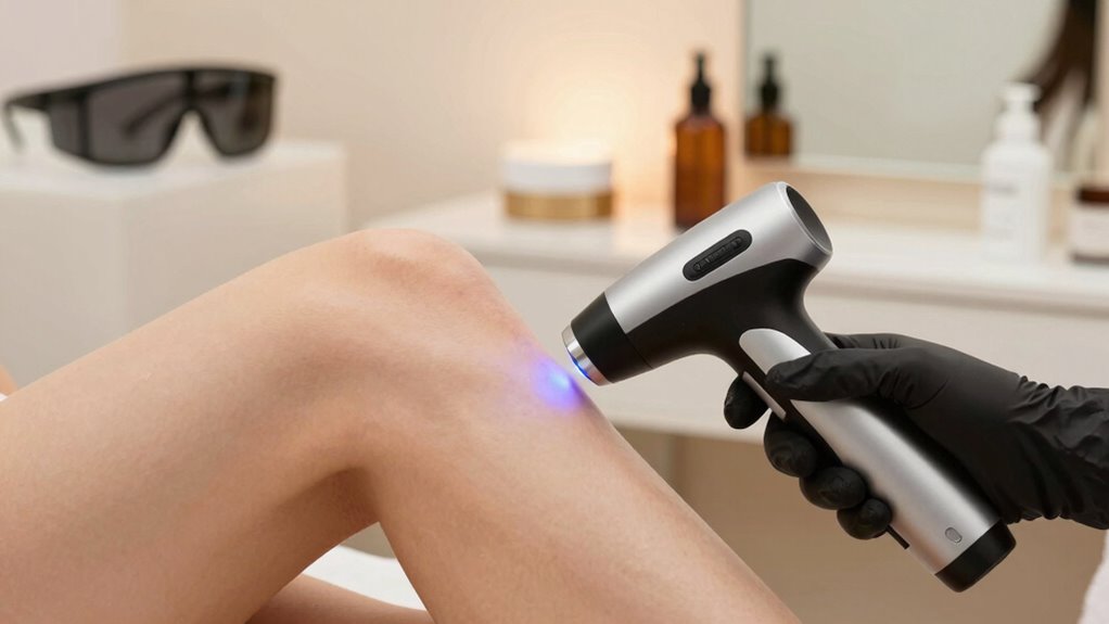 Before using a home laser device, it’s essential to carefully review the manufacturer’s instructions and understand how the device works. Knowing your skin sensitivity helps you determine the appropriate settings and treatment areas, reducing the risk of irritation. Before each session, make sure the device is properly maintained—clean the laser window and check for damages. Avoid using the device on sunburned or irritated skin, as this increases sensitivity and the chance of adverse reactions. Conduct a patch test on a small area to gauge your skin’s response. Keep the treatment area free of lotions, creams, or deodorants that could interfere with laser efficacy or cause skin reactions. Taking these precautions guarantees safer, more effective treatments at home.