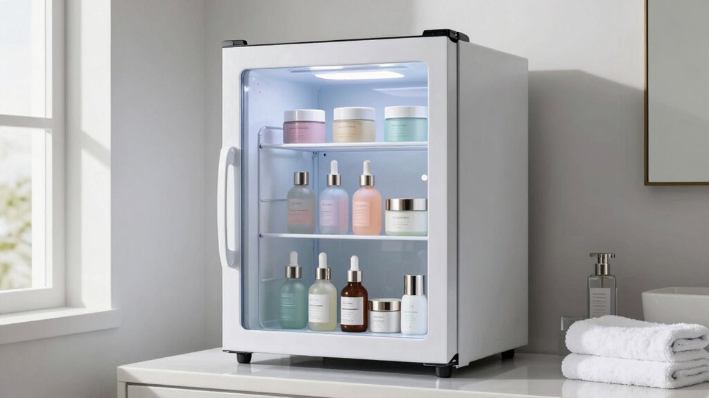 Skincare fridges are particularly effective at preserving products with sensitive active ingredients that degrade when exposed to heat and light. They keep these items at a consistent, cool temperature, minimizing temperature fluctuation that can reduce efficacy. This consistent environment is especially important for products like serums, eye creams, and masks, which are prone to deterioration. The aesthetic appeal of a skincare fridge also encourages regular use and proper storage. By maintaining a stable environment, you prolong product lifespan and preserve their potency. Additionally, air quality inside the fridge can influence product preservation, helping to protect formulas from environmental contaminants. Proper temperature control is crucial for maintaining the integrity of delicate formulas. A well-maintained fridge can also help guard against moisture exposure, which may compromise product stability. Furthermore, using proper organization within the fridge can prevent cross-contamination and ensure optimal storage conditions. Keep in mind, however, that not everything benefits equally. Items that don’t require refrigeration or are sensitive to cold may not see much advantage. Focus on products with delicate formulas for the best results. For optimal preservation, paying attention to storage conditions can further enhance product longevity.