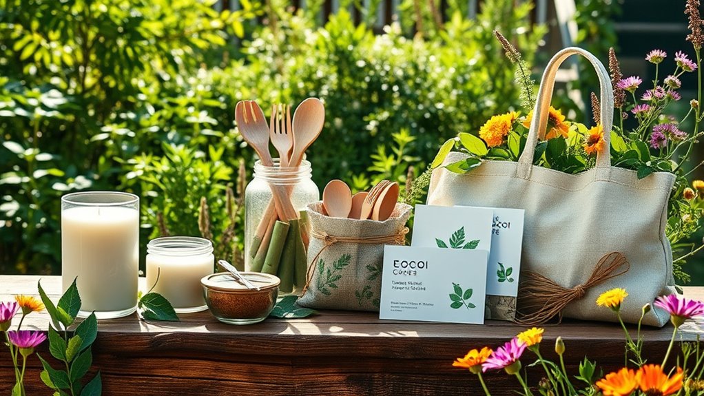 When choosing eco-friendly gifts in 2025, it’s essential to contemplate their environmental impact to make truly sustainable choices. I look for items made from sustainable materials like biodegradable seed paper, recycled wood, or natural soy wax, which help reduce waste and pollution. Opting for products from renewable resources conserves natural habitats and cuts down reliance on non-renewable materials like plastics and metals. I also prioritize items with eco-conscious certifications such as GMO-free or cruelty-free labels, ensuring responsible manufacturing. Reusable and plantable gifts, like seed calendars or glass jars, promote waste reduction and support eco-friendly habits. By selecting products that support sustainable production processes, I can minimize my carbon footprint and contribute to long-term environmental preservation.