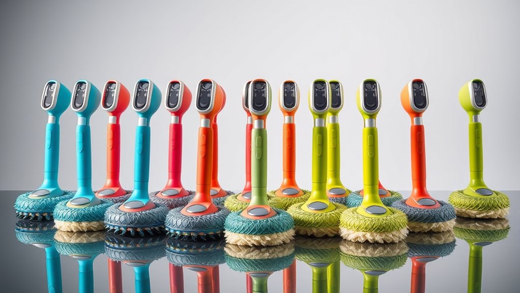 When selecting an electric spin scrubber, ease of use features can make a big difference in how comfortable and efficient cleaning becomes. An ergonomic handle and adjustable length help reduce strain and make maneuvering simpler. Easy-to-operate controls, like one-touch switches or long-press activation, boost convenience and safety. Multiple speed settings let you choose the right power level for different surfaces and tasks, enhancing versatility. A lightweight design and balanced weight distribution improve handling and lessen fatigue during extended use. Clear battery indicators and straightforward charging procedures prevent interruptions and confusion, ensuring continuous operation. These features collectively make the scrubber more user-friendly, saving time and effort while delivering effective cleaning. Prioritizing ease of use helps you enjoy a smoother, more comfortable cleaning experience.