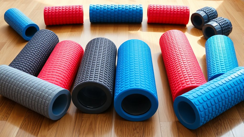 Surface texture plays a crucial role in how a foam roller feels and functions during your recovery routine. Different textures—smooth, textured, or ridged—offer varying levels of massage intensity and target different muscle groups. Textured surfaces, like ridges or patterns, can mimic deep tissue massage, helping to break up knots more effectively than smooth rollers. The firmness and pattern also influence comfort; softer textures feel gentler, while pronounced ridges provide a more intense experience. Some rollers are designed specifically for trigger point therapy, delivering targeted pressure to tight spots. Your choice depends on personal preference, sensitivity, and your recovery goals. Whether you want a gentle massage or a deep tissue feel, selecting the right surface texture can make a significant difference in your foam rolling routine.