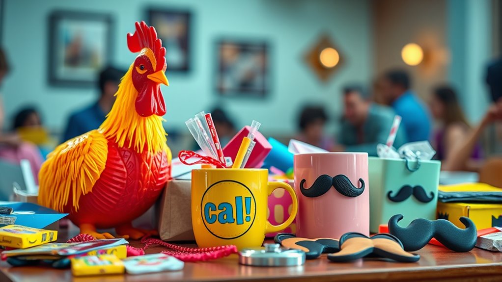 If you’re looking for the funniest gag gifts for adults, I’ve got some great ideas that will definitely get laughs. From plush stress-relievers like emotional support chicken nuggets to clever accessories like leather can coolers and decision dice, there’s something for every sense of humor. Add in quirky office pens, sound-effect buttons, and funny air fresheners, and you’ve got a perfect mix for any party or gag gift exchange. Keep going, and you’ll discover even more hilarious options!