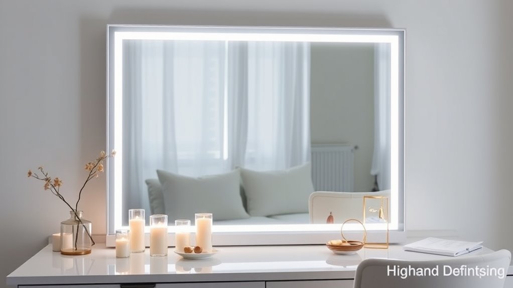 Choosing the right brightness level for an LED vanity mirror is essential because it affects how well you can see details during grooming tasks. Adjustable brightness, ranging from 10% to 100%, lets you customize the light to suit your needs. Stepless controls provide smooth *progressions* between dim and bright settings, giving you precise lighting adjustments. Higher brightness levels, usually over 600 lumens, are *vital* for detailed tasks like makeup application, shaving, or skincare. Bright enough lighting ensures clear visibility regardless of ambient conditions. Some mirrors feature memory functions that recall your preferred brightness, adding convenience and consistency to your routine. Ultimately, selecting a mirror with versatile brightness options helps you achieve *ideal* lighting for any grooming or beauty task.