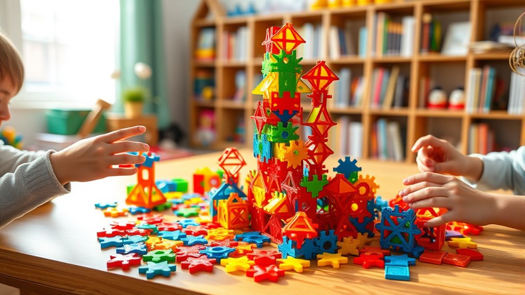 Compatibility and expansion options play a crucial role in maximizing the value of magnetic tile sets. When choosing, I look for sets that let kids combine different brands or expand their collection over time. Some brands, like Magna-Tiles and Connetix, use proprietary shapes, which means their pieces only fit within their own lines, limiting future growth. On the other hand, universal compatibility allows for mixing different brands, boosting creative possibilities and encouraging collaborative play. It’s important to take into account whether the set supports seamless expansion, so your child can add new pieces or sets later without hassle. This flexibility not only keeps play fresh but also makes the initial investment more worthwhile, enabling structures to grow and evolve as your child’s skills and interests develop.