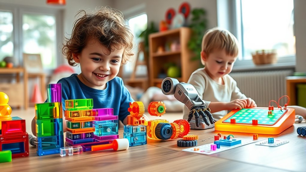 If you’re looking for the best STEM toys for toddlers that spark curiosity and promote learning, I’ve found some great options. From building sets and magnetic tiles to dinosaur kits and activity boards, these toys support early problem-solving, fine motor skills, and creative exploration in safe, engaging ways. Whether for preschoolers or slightly older kids, these picks help develop critical skills while keeping play fun. Keep exploring to discover the top choices that suit your child’s developmental stage.