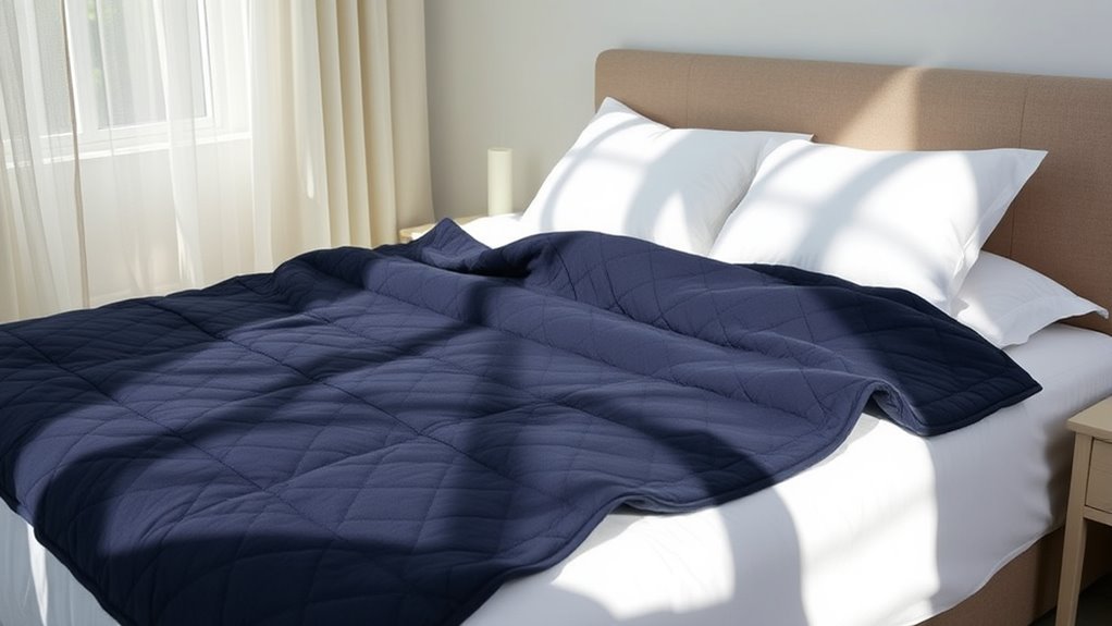 Have you ever felt hot and uncomfortable while trying to relax with a weighted blanket? If so, breathability and temperature control are key factors to contemplate. Look for blankets made with natural, moisture-wicking fabrics like cotton or microfiber, which promote airflow and help prevent heat buildup. Some blankets feature cooling elements like glass beads or ventilated designs to keep you cool, especially if you’re prone to overheating. Multi-layer constructions and breathable materials improve heat dissipation, making the blanket suitable for year-round use. Additionally, blankets with removable or adjustable covers let you customize your comfort for different seasons. Choosing a well-ventilated blanket ensures you stay cozy without feeling overheated, helping you relax and fall asleep more easily.